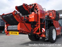 Bodenschonung ist auf der Potato Europe 2015 ein großes Thema. Auch für den vierreihigen Selbstfahrer-Siebkettenroder mit Reinigungseinheit und Bunker Dewulf Kwatro, der dank der 900 mm breiten Raupen, die für einen minimalen Bodendruck sorgt. Durch die Positionierung des Rodekanals vor den Raupen soll eine hohe Qualität der geernteten Kartoffeln gewährleistet werden und auch bei extrem nassen Bedingungen soll einer erfolgreichen Erntesaison nichts im Wege stehen. Der Bunker fasst nach Herstellerangaben 17,5 m³ um das Potenzial des Kwatro voll auszuschöpfen.