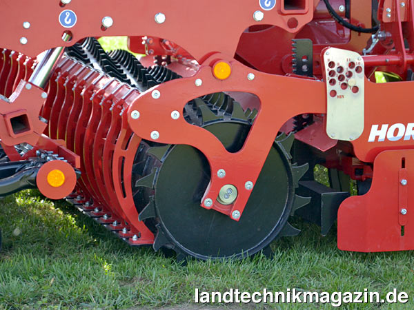 Auch die neuen Modelle der Horsch Express KR sollen sich durch intensive Saatbettbereitung auch unter schwierigen Bedingungen auszeichnen. Zu diesem Zweck verfügt die 3,5-m-Variante über 12 Kreisel und die 4-m-Version über 14 Kreisel. Um auch auf steinigen Böden über maximale Stabilität zu verfügen, ist kein Modell klappbar, Schnellwechselzinken auf Schlepp oder Griff sollen das Ergebnis zusätzlich verbessern. Der Rahmen der Express KR wurde so konzipiert, dass die Verstellung der Arbeitstiefe der Kreiselegge keinen Einfluss auf die Saattiefe hat – die Einstellung der Arbeitstiefe der Kreiselegge Kredo lässt sich übrigens leicht von außen durchführen und die Einstellung ist einfach ablesbar. Um die Kreiselegge auch solo nutzen zu können, können entweder die TurboDisc-Säschare (2. Generation) hydraulisch komplett ausgehoben werden, oder die Säeinheit durch das Lösen von vier Befestigungspunkten abgebaut werden.