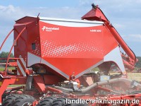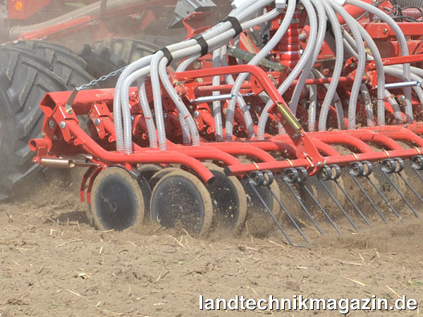 Der Scheibeneggensektion folgt ein großer Reifenpacker mit 900 mm Durchmesser. Der Boden wird somit vor der eigentlichen Aussaat rückverfestigt und gleichzeitig soll der Zugkraftbedarf durch die großen Räder deutlich reduziert werden.