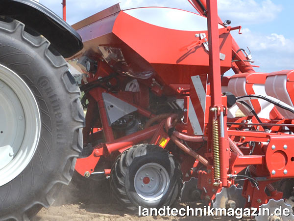 Als weitere Besonderheit nennt Kverneland Accord das neue Luftführungssystem. Ein Rohrsystem optimiert nach Herstellerangaben den Luftstrom wodurch die Saatqualität sowie die Düngerverteilung verbessert werden. Die Reihen sind an beweglichen Halterungen an einem 180x180 mm großen Vierkantrohr montiert. Die Optima mit hydraulisch variablem Teleskoprahmen kann mit nur einem Knopfdruck von drei Meter Transport- auf vier Meter Arbeitsbreite umgestellt werden.
