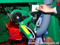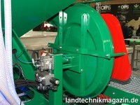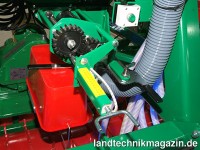 Bei der Saatgutdosierung setzt Regent in der pneumatischen Drillmaschine Ventra auf eine elektrisch angetriebene und elektronisch geregelte Universal-Dosiereinheit, die nach Herstellerangaben werkzeuglos auf Feinsämereinen umgestellt werden kann und Saatstärken von 1 bis 360 kg/ha (respektive bis 450 kg/ha bei Erbsen und Bohnen) ermöglicht. Abgedreht wird die neue Ventra M 3012 DS bequem und ohne dass hierfür Werkzeug erforderlich ist, über die Komfort-Abdreheinheit von der bereits erwähnten Plattform aus: Ein Eimer zum Auffangen des abgedrehten Saatgutes ist in einer Halterung immer mit an Bord. Zur Abdrehprobe wird dieser in seiner Halterung unter den Dosierer geschwenkt. Gleichzeitig schwenkt so der Saatgutabgang zum Verteilturm zur Seite und gibt so die Öffnung des Dosierers frei. Der Abdrehvorgang wird dann per Taster hinten an der Maschine gestartet – ein erneutes Aufsteigen in die Schlepper-Kabine zum Auslösen des Abdrehens erübrigt sich somit. Ein groß dimensioniertes, hydraulisch angetriebenes Gebläse ermöglicht die Bereitsstellung hoher Luftmengen bei geringer Drehzahl und damit niedrigem Leistungsbedarf.