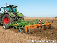 Die Catros+ 12003-2TX mit Arbeitsbreiten von 12 m beziehungsweise 12,25 m, mit erweitertem Scheibenfeld für den Einsatz bei Controlled Traffic Farming, zeigt Amazone als Neu- respektive Weiterentwicklung mit neuem Fahrwerks- und Klappkonzept. Durch die 5-teilige Klappung konnte Amazone eine innenliegende Positionierung des Fahrwerkes realisieren; davon sollen die Laufeigenschaften auf der Straße profitieren. Das Smart Frame System ermöglicht bei der Catros+ 12003-2TX die vollhydraulische Arbeitstiefeneinstellung der Scheiben von der Kabine aus und ContourFrame soll eine individuelle Anpassung der einzelnen Segmente in hügeligem Gelände sicherstellen. Für unterschiedliche Einsatzbedingungen gibt es laut Amazone eine Breite Auswahl an Scheiben – darunter jetzt auch die X-Cutter-Disc – und fünf verschieden Walzen für die Rückverfestigung.