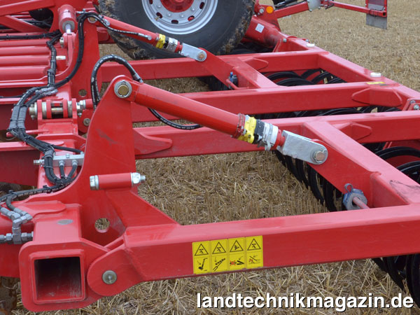 Ebenfalls optimiert wurde bei der Joker RT der Rahmen. Er ist stabiler und mit einem innenliegenden Klappmechanismus ausgestattet. Auch dieser dient der Stabilität und gleichzeitig dem Schutz der Hydraulikzylinder. Geklappt wird die Joker RT trotz ihrer Arbeitsbreite auf 3 m Transportbreite mit Hilfe einer speziellen Klapp-Logik. Das DiscSystem mit den neuen 52 cm Scheiben ist gezahnt und damit prädestiniert für aggressives Arbeiten und gutes Eindringen in den Boden, wobei die Scheiben auch durch das hohe Maschinengewicht unterstützt werden. Die paarweise Anordnung der Scheiben an den Aufhängungen gewährt einen großen Freiraum und Durchgang für Ernterückstände. Die Bodenanpassung und Steinsicherung der Joker RT erfolgt über die bewährte und robuste Gummilagerung. Die Scheiben verfügen über eine nach Unternehmensangaben absolut wartungsfreie und verschleißarme Lagerung mit Ölfüllung. Durch das Mittelfahrwerk vergrößert sich auch der Abstand zwischen den Scheibenreihen zum Packer. Somit hat der Erdfluss immer Zeit, sich zu beruhigen, und wird nicht vom DiscSystem in den Packer geworfen. Dies verbessert die Einebnung und dient der Einsatzsicherheit.