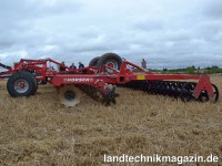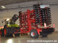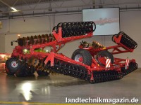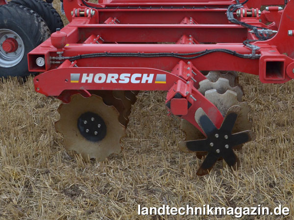 Das Mittelfahrwerk der neuen Horsch Joker 10/12 RT bringt nach Firmenangaben zahlreiche Vorteile mit sich. Zum einen ist die Gewichtsverteilung optimal und es unterbindet Springen oder Aufschaukeln. Der Maschinenschwerpunkt liegt beim Straßentransport nahe der Achse, was eine ruhige und sichere Fahrt gewährleistet. Zum anderen macht das Mittelfahrwerk die Maschine wendiger und ermöglicht durch mehr Anbauraum den Einsatz eines Doppelpackers. Der Doppel-RollPack-Packer mit U-Profil-Ringen hat einen Durchmesser von 55 cm. Er ist sehr stabil, für alle Bodenarten geeignet und soll auch bei hohem Einsatztempo, was typisch für eine Kurzscheibenegge ist, unempfindlich gegen Steine bleiben. Die ineinandergreifenden Packerringe dienen der Selbstreinigung. Ihr Strichabstand beträgt 13 cm, was eine gute Rückverfestigung und Krümelung des Bodens zur Folge hat.