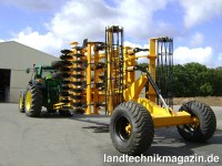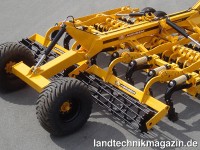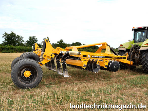 Je nach Bodenbeschaffenheit und Vorkultur sollten die Zinken, so Agrisem, besser vorne, in die Mitte oder zum Schluss angebracht werden. Mit dem MAXIMULCH ist alles frei wählbar, so dass der Nutzer seine Maschine für eine optimale Arbeit frei zusammenstellen kann. Zudem kann auch ohne Zinkenreihe gearbeitet werden, so dass der MAXIMULCH dann in eine schnelle Kurzscheibenegge mit einzeln gefederten Scheiben, eine Disc-O-Mulch umgewandelt wird. Die patentierten Bröcklerbleche sind hinter den Scheibenreihen angebracht und bereiten das feine Saatbett vor. Sie können geneigt werden, um entsprechend der Geschwindigkeit ihre Effizienz zu steigern. Die Lockerungszinken sind mit einer patentierten, versetzten und auf Griff stehenden Spitzen versehen. Sie können mit zweierlei Federsicherungen – einer Scherbolzensicherung oder einer Non-Stop-Steinsicherung – ausgerüstet werden. Für die Scheibenreihen greift Agrisem auf Teile der erfolgreichen Disc-O-Mulch zurück. So verfügt der MAXIMULCH über die 35-mm-3D-Federung in Verbindung mit einer Scheibe mit einem Durchmesser von 560 mm oder 610 mm. Die Feder arbeitet Windung an Windung, so dass ein laut Agrisem ein Stoß-Vibrationseffekt erzeugt wird, der den Kraftstoffverbraucht senkt und das Eindringen in harte Böden verbessert. Der Leistungsbedarf liegt nach Herstellerangaben zwischen 50 und 60 PS pro Meter, je nach Arbeitsbreite, Bodenbeschaffenheit beziehungsweise gewünschter Geschwindigkeit.
