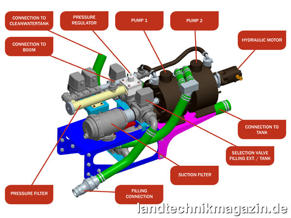 Mit GreenFlowPlus präsentiert Agrifac jetzt ein System bei dem keinerlei Restflüssigkeit mehr im Tank verbleiben soll, da der Tank während des Spritzens komplett entleert werden kann. Dafür wurde der Auslass des Tanks über dem GreenFlowPlus System positioniert, um die Schwerkraft zu nutzen. Weitere Gewinne werden durch die Reduzierung der Restflüssigkeit im GreenFlowPlus System selbst erzielt. Dies wurde laut Agrifac durch ausgefeilte Technik sowie kompakte Bauweise und Installation erreicht. Alle Komponenten sind zudem leicht erreichbar an der Rückseite der Spritze angebracht. Zum GreenFlowPlus System gehört auch ein völlig neuer druckgesteuerter Regler, der schnell auf sich ändernde Arbeitsbreiten oder auf die mit GPS gesteuerte Teilbreitenschaltung reagieren kann. Des Weiteren enthält der neue Druckregulator keine Verschleißteile mehr, um problemfreies Spritzen zu garantieren. Ein neuer, selbstreinigender Hochleistungsdruckfilter schützt das GreenFlowPlus System nach Herstellerangaben vor Druckabfall oder -verlust und reinigt sehr effizient. Die 25 mm großen Spritzleitungen aus Edelstahl sollen konstanten Druck und sehr hohe Durchflusskapazität durch niedrigen Durchflusswiderstand garantieren – wichtig für eine hohe Sprühgeschwindigkeit und große Arbeitsbreiten.