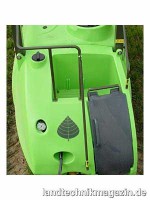 Über die breite, klappbare Aufstiegsleiter hat man Zugang zur Plattform vor dem Behälterdeckel. In diesem Deckel befinden sich in den Hohlräumen die 420 Liter Spülwasser, die zum Reinigen des Gerätes dienen. Für Wartungsarbeiten kann diese Abdeckung nach vorne geklappt werden. Die optionale Ringspülleitung mit den pneumatisch geschalteten Düsenkörpern ermöglicht eine optimale Nutzung der ständigen Zirkulation der Spritzbrühe.