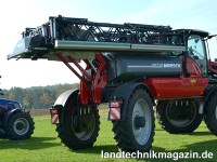 Das 9-teilige Gestänge (30 bis 36 m) wird, wie erwähnt, von der prämierten Gestängesteuerung BoomControl auch bei hohem Arbeitstempo und coupiertem Gelände ruhiggehalten. Um auch für den Einsatz in hohen Kulturen wie Mais oder Sonnenblumen gerüstet zu sein, ist die Bodenfreiheit von 1,4 bis 1,6 m stufenlos verstellbar; die Spurweite der hydraulischen Einzelradaufhängung lässt sich von 2,25 bis 3 m stufenlos einstellen.
