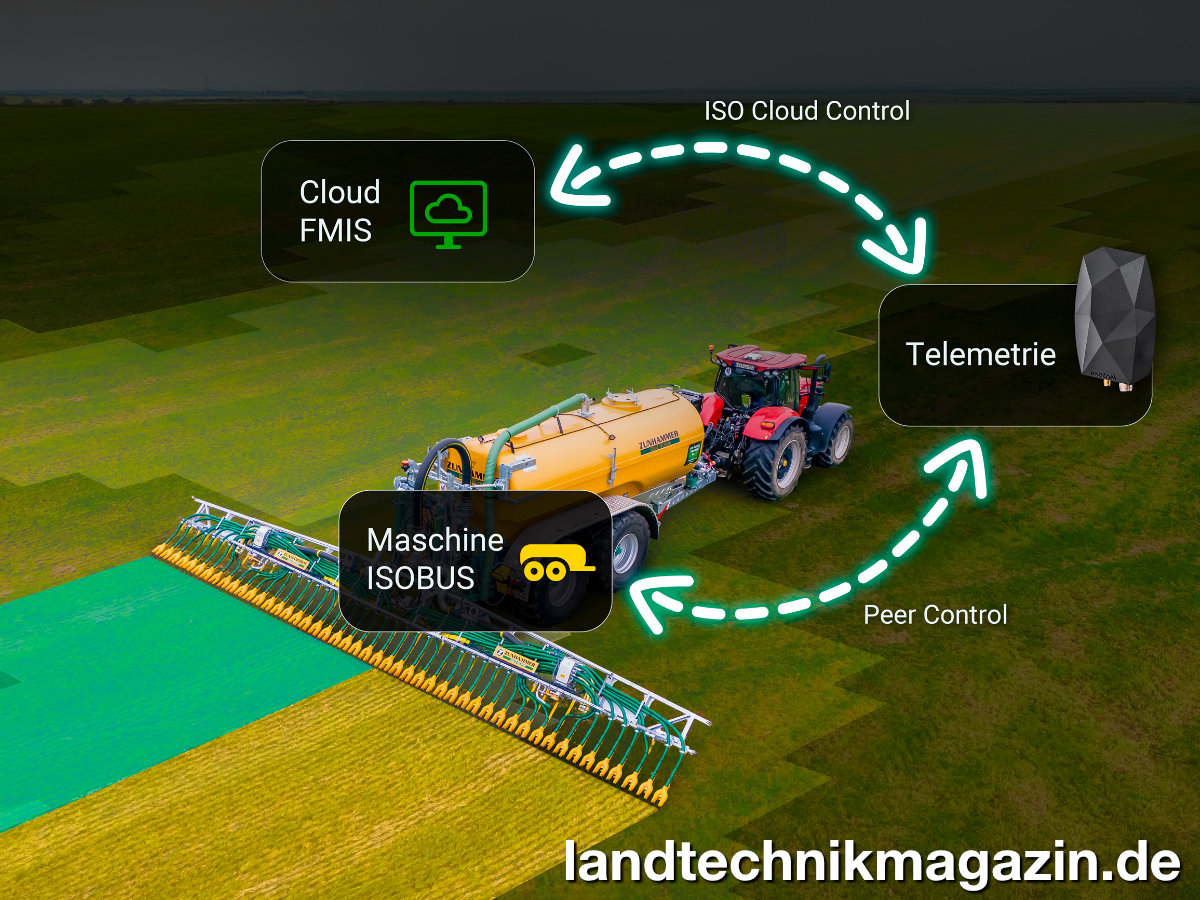 Der Datenkreislauf von den Erntedaten, den Bodenproben, der Aussaat über die Düngung und Pflanzenpflege bis zur nächsten Ernte wird komplett automatisiert. Herzstück ist dabei der ISO-Bus Task-Controller der direkt an ein herstellerunabhängiges cloud-basiertes FMIS angebunden ist. Gibt es beispielsweise Änderungen bei einer Dünge-Applikationskarte mit größeren Abständen zu Gewässern, wird diese direkt via Mobilfunk auf den Task-Controller übertragen. Damit kann der Fahrer auf dem Feld direkt mit den aktualisierten Daten weiterarbeiten. Ein manueller Datentransfer, wie bisher üblich, entfällt. Durch die konsequente Nutzung von standardisierten Schnittstellen arbeitet das gesamte System herstellerunabhängig.
