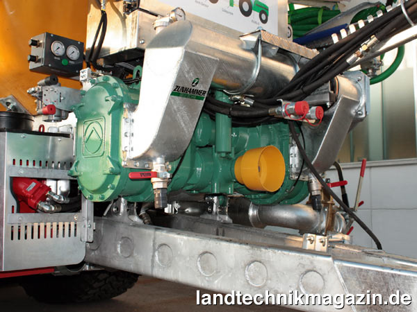 Zwei Drehkolbenpumpen (Zunhammer Eco-Duo-System) fördern nach Herstellerangaben bis zu 12.000 l/min zum Verteiler. Sie sind getrennt nach linker oder rechter Arbeitsbreite abschaltbar. Für schmale Verteiler wie z.B. Grubber wird zum Ausbringen nur eine Pumpe genutzt, um die Ausbringmenge anzupassen.