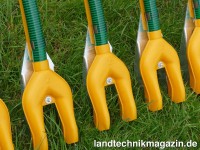 Als Lösung für dieses Problem bietet es sich an, schmalere und damit auch weniger voluminöse Güllestreifen abzulegen. Hierfür einfach die Anzahl der Schleppschuhe zu verdoppeln, schied für Zunhammer allerdings aus – schließlich soll der Schleppschuhverteiler nicht unnötig schwer werden und bezahlbar bleiben. Vielmehr entwickelten die oberbayerischen Gülletechnik-Spezialisten mit der neuen Duplo-Düse quasi einen doppelten Schleppschuh mit zwei Ausläufen, der anstelle der gewöhnlichen Schleppschuhe am Ende der Gülle-Ablaufschläuche montiert wird. So ergibt sich ein halbierter Strichabstand von 12,5 cm und zudem ein schmalerer, weniger voluminöser Güllestreifen pro Auslauf, da der Güllestrom aus einem Ablaufschlauch auf zwei Ausgänge aufgeteilt wird. Gefertigt wird die Duplo-Düse aus widerstandsfähigem Kunststoff, lediglich die Gleitkufe, mit der die Düse auch am Verteiler beziehungsweise der Feder des Gleitfußes montiert wird, besteht aus verzinktem Stahl. Das Gewicht des Schleppschuhverteilers bleibt so bei Ausrüstung mit den Duplo-Düsen statt der Standard-Schleppschuhe praktisch unverändert.