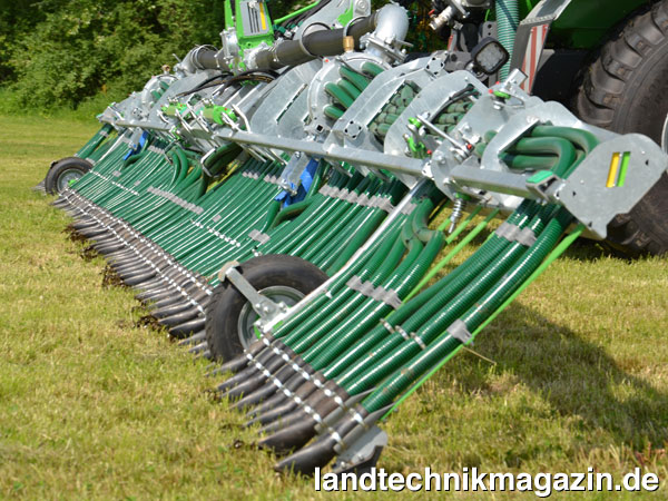 Die Joskin PENDISLIDE PRO Baureihe besteht aus vier Modellen in den Arbeitsbreiten 12 m, 13,5 m, 15 m und 18 m, die über einen Zwischenreihenabstand von 25 cm verfügen. Joskin unterstreicht, dass bis zu einem Raddurchmesser von 1.675 mm keine Vierpunktaushebung benötigt wird, da vier Hydraulikzylinder, die auch das Antitropfsystem (System Twist) aktivieren, das Gestänge für Ausbringung und Transport über die Radabdeckungen heben. Ein weiterer Vorteil dieser Montage ist die Möglichkeit der Verwendung eines Exaktverteilers.
