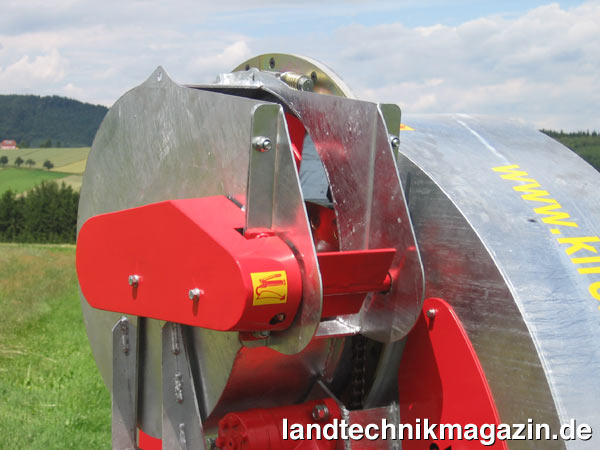 Seitenstreuer zum Ausbringen von Stallmist erfreuen sich in alpinen Regionen, und damit auch im Kirchner Heimatmarkt Österreich, großer Beliebtheit. Gerade im Bereich dieser Ausbringgeräte gibt es aber eine Reihe Patente, welche die bisherigen technischen Ausführungen schützen. Die Konstrukteure bei Kirchner haben deshalb nach neuen Lösungen gesucht, um keines dieser Patente zu verletzen. Das Ergebnis ist, so Kirchner, eine Maschine, die sehr viele Vorteile aufzuweisen hat: So ist das Wurfrotorgehäuse zwar auf beiden Seiten hydraulisch schwenkbar, es wird jedoch nur ein kleines Gehäuse bewegt, wodurch eine hohe Drehgeschwindigkeit ermöglicht und die Kippgefahr in Steilhängen wesentlich reduziert wird, da der Schwerpunkt durch das Schwenken nur unwesentlich verändert wird. Weiters ist der komplette Antrieb Platz sparend untergebracht und damit eine kurze Bauweise möglich. Der neue Kirchner Seitenstreuer besitzt darüber hinaus auch keinen umlaufenden Kratzboden, welcher den Transporter oder die Straße beim Abstreuen verschmutzt. Zusätzlich kann die Wanne dadurch bestmöglich geschlossen bleiben und wird besonders stabil.