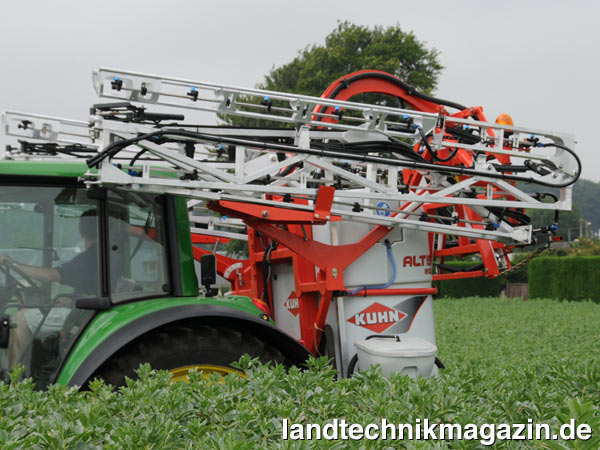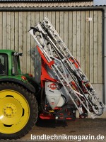 Das bewährte Alu-Gestänge der Kuhn-Feldspritzen stammt nun zu 100 % aus dem Hause Kuhn. Es wurde nach Herstellerangaben speziell für die Feldspritzen DELTIS und ALTIS konzipiert und genau darauf abgestimmt. Da nur 3 Ausleger vorhanden sind und die Klappgelenke bei der Pflanzenschutzanwendung auf dem Feld verriegelt werden, soll ein Schwingen des Gestänges wirkungsvoll verhindert und eine hohe Stabilität erreicht werden. Die geringe Anzahl an Gelenken sorgt nach Herstellerangaben darüber hinaus für eine hohe Funktionszuverlässigkeit. Außerdem überzeugt der Werkstoff Aluminium durch sein geringes Gewicht: Das Gestänge samt Rahmen wiegt laut Kuhn bei einer Breite von 21 Metern nur 300 kg. Außer seines leichten Gewichts hat Aluminium noch den Vorteil, dass es korrosionsbeständig ist, wodurch das MEA-3-Gestänge gegenüber Pflanzenschutzmitteln und auch Düngern völlig unempfindlich ist. Das 21 Meter breite Gestänge erreicht bei der Einklappung der äußeren Gestängeteile eine Arbeitsbreite von 15 Metern. Damit erhöhen sich, so Kuhn, die Einsatzmöglichkeiten beim Einsatz auf mehreren Betrieben mit unterschiedlichen Fahrgassenabständen.