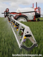 Für die neue Feldspritze LEXIS 3000 hat Kuhn die 18 bis 21 m breiten Gestänge MEA2 und MTA2 entwickelt, die durch das verwendete Material, ihre kompakte Klappung und die Aufhängungen EQUILIBRA respektive TRAPEZIA für geringes Gewicht, Stabilität auf dem Feld und kompakte Abmessungen bei der Straßenfahrt sorgen sollen. MEA2 arbeitet mit der Gestängeaufhängung EQUILIBRA und einem Pendelgestänge in Verbindung mit einer hydropneumatischen Schwingungsdämpfung. Beide Gestänge verfügen über jeweils zwei Aluminiumausleger pro Seite. Das Gelenk wurde mit einer mechanischen Verriegelung versehen, die die Schwingungsdämpfung und damit die Stabilität des Gestänges verbessern soll. Zusätzlich sind beide Gestänge mit einem automatischen, mechanischen Hangausgleich ausgerüstet, der das Gestänge parallel zur Radachse der Feldspritze ausrichtet und damit die Anpassung an die Bodenkontur unterstützt.