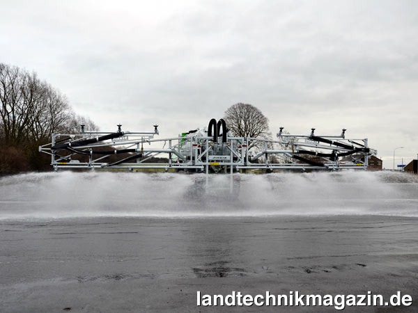 Die Basis des Multitwist-Düsenbalkens bildet ein robuster Rahmen mit 15, 18 oder 24 m Arbeitsbreite, der an das Hubwerk des Fasses angebaut wird. Ab einer Arbeitsbreite von 18 m ist der Multitwist-Düsenbalken mit einer doppelten Einklappung versehen. Durch das zusätzliche Gelenk lassen sich an den Enden weitere Elemente mit 1,50 m, beziehungsweise 4,50 m beim 24-m-Modell, anbringen und so die bereits erwähnten Arbeitsbreiten von 18, 21, 24 und 27 m erzielen. Durch den modularen Aufbau kann die Erweiterung um zusätzliche Elemente auch nachträglich vorgenommen werden. Zudem ist es auch möglich, auf das Ausklappen der zusätzlichen Elemente zu verzichten und so mit Teilbreiten zu arbeiten. Dazu müssen die Enden der Elemente mit einem „Stopfen“ versehen werden. Auf diese Weise lässt sich etwa beim 21-m-Modell die Arbeitsbreite auf 18 m verringern, beim 27-m-Modell auf 24 m, usw.