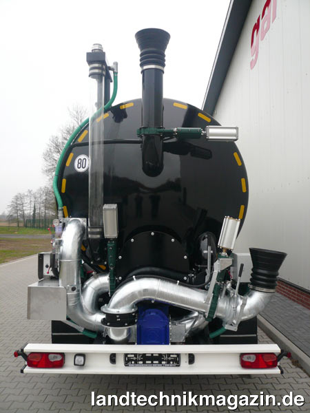 Bei dem hier produzierten Tanksattelauflieger handelt es sich um das Modell GARANT TSA 30.000 P Edelstahl. Er ist mit einer Vogelsang Drehkolbenpumpe VX 186-260 Q mit ca. 6.000 l/min Förderleistung ausgestattet. Der Saugrüssel mit Nennweite 200 ist zusätzlich mit einer Kreiselpumpe NW 200 mit 130 l Ölleistung ausgerüstet, um ein noch schnelleres Befüllen zu ermöglichen. Hinten verfügt der Kotte Tanksattelauflieger über einen Andocktrichter oben in der Rückwand des Behälters sowie einem Ansaugstutzen NW 150 mit Drehgelenk, an den ein weiterer Andocktrichter für die Entnahme der Gülle angebaut werden kann. Die Abschaltautomatik wird über einen Schwimmer gesteuert, der durch die pneumatische Verkettung der Schieber diese entsprechend verstellt. So kann es nicht zum Überlaufen des Anhängers kommen. Außerdem verhindert die pneumatische Verkettung der Schieber laut Kotte einen Druck- bzw. Vakuumaufbau im Behälter. Die Bedienung des Tanksattelaufliegers erfolgt über die Fernbedienung GARANT MiniControl von der Lkw-Fahrerkabine aus. Alternativ kann die Befüllung und das Umpumpen auch vom Heck des Aufliegers aus gesteuert werden.