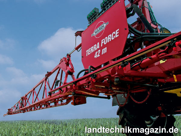 Das neue TERRA FORCE Gestänge wird an den Hardi COMMANDER Anhängegeräten mit 6.600 l mit Arbeitsbreiten von 36 bis 42 m angeboten. Das 3-fach geklappte TERRA FORCE verfügt über angewinkelte Klapppunkte, die das Gestänge beim Transport kompakter machen sollen. Eine Teilklappung kann auf Wunsch geliefert werden.