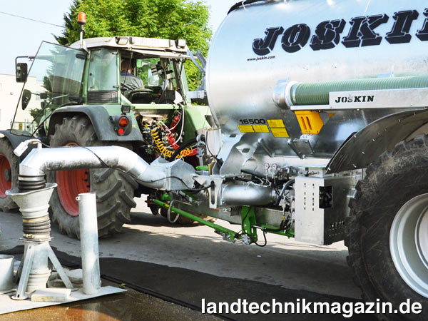 Der neue Jumbo Gülle-Ansaugarm verfügt nach Herstellerangaben über 8 Zoll Schlauchdurchmesser und bietet so eine gute Pumpleistung. Wahlweise kann diese Variante des JUMBO-Auslegers rechts oder links der Fahrtrichtung angebaut werden. Er ist laut Joskin einfach und robust konzipiert, so dass eine hohe Ansaugleistung zu geringeren Kosten möglich ist. Ein doppeltwirkender Zylinder ermöglicht das Absenken und Anheben vom Traktor aus. In Transportposition ist der Ausleger durch einen Sicherheitshaken gehalten, ähnlich wie der bisherige JUMBO-Ansaugarm. Allerdings wird dieser Haken mechanisch mittels Seilzug aus der Schlepperkabine gelöst.