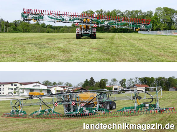 Interessant ist beim neuen Zunhammer Tele-Fix die bereits erwähnte Möglichkeit mit verschiedenen Arbeits- respektive Gestängebreiten fahren zu können. Hierzu wird die Teleskopier- und Klappfunktion des Gestänges mit einer Teilbreitenschaltung kombiniert, die das Abschalten einzelner Segmente des Schleppschuhverteilers erlaubt. Werden beispielsweise beim 24-m-Tele-Fix die jeweils 1,5 m breiten Außenspitzen des äußeren Segmentes eingeklappt und abgeschaltet, reduziert sich die Arbeitsbreite auf 21 m. Werden zusätzlich die jeweils 1,5 m breiten Innenspitzen des äußeren Segmentes abgeschaltet, eingeklappt und dieses darüber hinaus per Teleskopfunktion nach innen geschoben, ergibt sich eine Arbeitsbreite von 18 m. Im Gegensatz zu einer reinen Teilbreitenschaltung, die nur die Arbeitsbreite reduziert, ändert sich bei Zunhammers Lösung also auch die Breite des kompletten Gestänges, so dass der Tele-Fix im Beispiel als „echter“ 18-, 21- oder 24-m-Gülle-Schleppschuhverteiler gefahren werden kann. Vorteilhaft ist das immer dann, wenn der Tele-Fix in voller Breite nicht auf das Feld passen oder mit Hindernissen kollidieren würde. Selbstverständlich kann die Teilbreitenschaltung auch ohne Teleskopierung und Klappung des Gestänges genutzt werde. Darüber hinaus können die Verteilköpfe einzeln komplett abgeschaltet werden. Zunhammer sieht dadurch eine neue Fahrstrategie bei der Gülledüngung auf langen Schlägen gegeben, wenn der Fassinhalt bei voller Arbeitsbreite nicht für die ganze Feldlänge ausreichen würde. In diesem Fall empfiehlt Zunhammer zunächst nur mit den beiden äußeren Exacut-Verteilern zu arbeiten und erst im zweiten Schritt die so ungedüngt verbliebene Innenspur mit den beiden inneren Verteilköpfen zu bearbeiten. Wer diese Möglichkeit geschickt einsetzt, kann das – beim Ansetzen mitten im Feld unvermeidliche – erneute Überfahren bereits begüllter Flächen vermeiden. Die bei dieser Methode gerade nicht im Einsatz befindlichen Schleppschuh-Segmente können übrigens hochgeschwenkt werden, um unnötigen Verschleiß an den Gleitschuhen zu vermeiden.