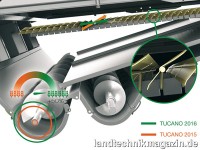 Unterschiede zwischen den beiden TUCANO 500 Modellen gibt es in erster Linie beim Dreschsystem, das beim TUCANO 560 BUSINESS mit einer 1.320 mm und beim TUCANO 570 mit einer 1.580 mm breiten Trommel arbeitet sowie bei der Reinigung, die beim neuen TUCANO 560 BUSINESS mit einer 4-fach-Turbine und beim TUCANO 570 mit einer 6-fach-Turbine ausgerüstet ist. Darüber hinaus fällt die Gesamtsiebfläche der Reinigung mit 4,70 m² beim TUCANO 560 BUSINESS gegenüber den 5,65 m² des TUCANO 570 um knapp einen Quadratmeter kleiner aus. Mit der jetzt gebotenen Motorleistung und in Verbindung mit dem APS HYBRID SYSTEM soll der neue TUCANO 560 BUSINESS die Durchsatzleistung eines größen 6-Schüttler-Mähdrescher mit den kompakten Abmessungen eines 5-Schüttlers verbinden. Laut Claas bleibt bei diesem Modell die Transportbreite selbst bei 800 mm breiter Bereifung unter 3,50 m (TUCANO 570: 3,75 m), so dass Straßenfahrten problemlos möglich sein sollen. Das Korntank-Volumen gibt Claas für den TUCANO 560 BUSINESS übrigens mit 9.000 l an.