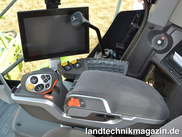 In der Kabine der neuen Claas TUCANO Generation findet sich ein neues CEBIS Terminal mit 12-Zoll-Touchscreen-Monitor und eine neue Bedienarmlehne, die einerseits eine Direktverstellung wichtiger Funktionen über Schalter ermöglicht und anderseits über ein CEBIS Bedienfeld verfügt. Wird eine Einstellung per Schalter aufgerufen, öffnet sich das Dialogfeld im CEBIS parallel. Das Terminal kann in einem weiten Bereich geschwenkt werden, um die Sicht auf den Erntevorsatz freizugeben. Claas betont, durch die intuitive Gestaltung der Dialoge (angelehnt an die Smartphone-Bedienung) können auch ohne Vorkenntnisse des Mähdreschers alle wesentlichen Funktionen gesteuert werden. Zusätzlich lassen sich „Favoriten“ anlegen, also besonders häufig verwendete Funktionen, die sich dann über ein Bedienfeld am CMOTION Multifunktionshebel aufrufen lassen.