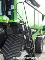 In vielen Einsatzsituationen sorgen Raupenfahrwerke für sicheren Stand und niedrigeren Bodendruck bei gleichzeitig verbesserter Traktion. Ab sofort ist deshalb für alle Modelle der 60er-Baureihe auch ein Raupenfahrwerk für die Vorderachse lieferbar. Dabei bewegt sich die lieferbare Bandbreite der Raupen von 762 bis 915 mm; die Aufstandsfläche beträgt 1,43 bis 1,72 m². Die 60er Baureihe ist laut Deutz-Fahr der einzige 6-Schüttler-Mähdrescher der beim Einsatz von Raupen mit 762 mm Breite eine Außenbreite von unter 3,5 m besitzt. Damit kann problemlos eine Ausnahmegenehmigung bei Fahrten auf öffentlichen Straßen beantragt werden. Kommen Raupenfahrwerke zum Einsatz werden auch die Aufstiegsleitern entsprechend angepasst und verfügen über einen neuen Klappmechanismus und klappbare untere Stufen, so dass ein sicherer Aufstieg und Fahrbetrieb jederzeit gewährleistet ist.