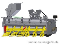 Bei der völlig neu entwickelten Köpfer-Roder-Einheit handelt es sich um einen aus der Kabine während der Fahrt umschaltbaren Kombiköpfer und das mit Einzelschwinger und hydraulischer Steinsicherung ausgerüstete Rodeaggregat. Die Tiefenführung wird über Tasträder gesteuert. Einzigartig ist laut Kleine die stufenlose Justierung der Scharstellung zur Rübe. Der neue OPTI-CUT Nachköpfer ist mit Schnittstärkenautomatik und integrierter Köpfstärkenverstellung ausgerüstet. Optional ist das Aggregat mit hydraulisch verschiebbarer Reihenweite von 45 auf 50 cm lieferbar.