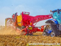 Beim selbstfahrenden Kartoffelroder VARITRON 470 richtete Grimme den Fokus auf die Rodetechnik. Nach Unternehmensangaben wurden die Aufhängungen und Umlenkungen der Siebbänder und der Zupfwalze beim Rollenseparator umfassend optimiert, um die Standfestigkeit zu erhöhen und das Trennergebnis zu verbessern. Zusätzlich verfügt der VARITRON 470 Platinum TERRA TRAC nun über eine serienmäßige Steinsicherung, die den kompletten Scharträger schützen soll und somit die Standzeiten bei Hindernis-Kontakt deutlich reduziert. Grimme unterstreicht die Förderleistung des Ringelevators, der mit bis zu 200 t/h über 30 % mehr fördere als bei vergleichbaren Rodern üblich und trotzdem die Kartoffeln mit reduzierter Aufprallgeschwindigkeit sehr schonend in die Taschen verteile. Unverändert hoch ist die Vielzahl von einsetzbaren Trenngeräten: Feinkrautelevator, Rollenseparator, MultiSep, Vario-RS, Doppel MultiSep sowie eine Kombination aus Rollenseparator respektive Vario-RS und MultiSep.