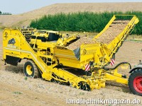 Neu beim Keiler 2L ist der Überladebunker. Nachdem der eigentliche Bunker lediglich die Funktion eines Puffers übernimmt, etwa beim Anroden oder wenn gerade kein Abfuhrgespann verfügbar ist, fällt dessen Kapazität mit laut ROPA 5,5 t genau 2 t kleiner aus als beim normalen Keiler 2. Bunkerwanne und Entladeband sind baulich voneinander getrennt. Eine Überleitwalze mit 185 mm Durchmesser aus PU-Scheiben sorgt für eine schonende Übergabe der Kartoffeln vom Bunker auf das Entladeband und reinigt zusätzlich lose Erde ab. Beim Entladeband handelt es sich um ein direkt angetriebenes, gummiertes Stabband mit laut ROPA 15 mm Stabdurchmesser, 30 mm Teilung und einer lichten Weite von 20 mm. Die Breite des Entladebandes gibt ROPA mit 2.000 mm an. Um ein flexibles und komfortables Entladen zu ermöglichen, hat ROPA das Entladeband dreifach knickbar ausgeführt. Bei einer Überladehöhe von 3,5 m soll so eine Eintauchtiefe von 600 mm in den Anhänger problemlos möglich sein. Die maximale Entladehöhe beziffert ROPA mit 4,1 m.