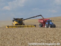 Das Korntankvolumen des CR7.90 beziffert New Holland wie bisher mit 9.500 l, das des CR8.80 und CR8.90 auch weiterhin mit 11.500 l. Beim CR9.80 und CR9.90 wurde das Korntankvolumen um weitere 1.000 l erhöht und beträgt jetzt 12.500 l. Die Abtankgeschwindigkeit beträgt bei den genannten Modellen 126 l/sec. Beim neuen CR10.90 beträgt das Korntankvolumen sogar 14.500 l; um den Abtankvorgang zu beschleunigen, beträgt die Abtankgeschwindigkeit hier 142 l/sec. Optional lässt sich auch der CR9.90 mit dem 14.500-l-Korntank und in Verbindung damit auch mit der höheren Abtankgeschwindigkeit ausstatten. Das 10 Meter lange, klappbare Abtankrohr wurde nach Firmenangaben an die größten Erntevorsätze und höchsten Anhänger angepasst. New Holland unterstreicht, dass durch das große Fassungsvermögen des Korntanks in Verbindung mit der hohen Abtankgeschwindigkeit und den langen Tankintervallen während des Arbeitstages keine Zeit vergeudet wird.