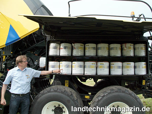 Hinten, auf der rechten Maschinenseite gibt es bei der New Holland BigBaler im optionalen »Comfort Paket« eine zusätzliche, große Aufbewahrungs-Box zum Mitführen von Werkzeug, Schneidwerks- oder Blindmessern, etc. sowie (unterhalb der Box) einen Wasserbehälter. In diesem Ausstattungspaket ist auch die Service-Reling um die Wartungsplattform auf der Maschine enthalten.