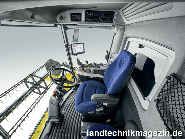 Die Harvest-Suite-Luxuskabine ist zweifellos das Highlight der neuen New Holland Mähdrescher CX5 und CX6. Neben 3,7 m³ Raumvolumen und 6,3 m² Glasfläche bietet sie nun ein über die volle Kabinenbreite reichendes Heckfenster. Der Fahrersitz mit Luftfederung gehört ebenso zur Serienausstattung wie der breite, verstellbare IntelliView IV-Monitor mit Farb-Touchscreen (26,4 cm). Die verstellbare Seitenkonsole mit dem bewährten, kraftgesteuerten CommandGrip-Bedienhebel, die verschlankte Lenksäule und die Fußstützen runden den Fahrerplatz-Komfort ab. New Holland betont außerdem den geringen Geräuschpegel von nur 73 dB[A].