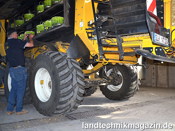 Eine weitere Besonderheit der New Holland BigBaler 1290 High Density Quaderballenpresse ist das Achskonzept, bei dem eine hydraulische Federung mittels zweier Stickstoffblasen realisiert wird. Vorder- und Hinterrad sind hydraulisch verbunden und reagieren gegenläufig: weicht das Vorderrad nach oben aus, wird das Hinterrad auf der gleichen Seite nach unten gedrückt. Nebeneffekt dieses Fahrwerkes ist, dass die komplette Ballenpresse durch einen Hydraulikblock auf beiden Seiten angehoben oder gesenkt werden kann, um beispielsweise den Zugang zu den Garnkästen (oder den Messern) zu erleichtern. Neu zur Saison 2021 ist eine 60-km/h-Version.