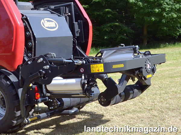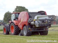 Wirkte der damals vorgestellte Prototyp optisch etwas altbacken (Vicon präsentiert mit der FastBale erste Non-Stop Festkammer-Press-Wickelkombination), ist die fertige Festkammerpresse durch neue Kunststoffverkleidungen (hinter denen sich Stauräume verbergen) auch designmäßig ein Leckerbissen. Beibehalten wurde natürlich das technische Konzept, das mit zwei festen Presskammern arbeitet und so durchgängig Ballen produziert. Die Weiterentwicklung des Vorserienmodells beinhaltet im Übrigen auch einen Ballenaufsteller, der den Ballen direkt auf der Stirnseite ablegt und eine Folienbindung. Als Rechenexempel erläutert Kveneland, dass, wenn bei einem Lohnunternehmer, der 400 Ballen am Tag produziert, die 18 bis 20 Sekunden Arbeitsunterbrechung pro Ballen wegfallen, 120 bis 133 Minuten am Tag eingespart werden könnten. Kverneland gibt übrigens 100 mögliche Ballen pro Stunde an (natürlich abzüglich des Wickelfolientausches).