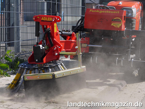 Die neue Wildkrautbürste wurde für große Pflasterflächen konzipiert, lässt sich durch die Montage an einen Seitenausleger aber auch ausschwenken, um Ecken und Rinnsteine gezielt anzusteuern. Gerade für dieses Ausschwenken hat Adler ein Funkfernbedienung entwickelt. Zu den zahlreiche Funktionen, die Kunden je nach Bedarf wählen können, gehören beispielsweise die mechanisch oder hydraulisch gesteuerte Längs- und Querneigung. Das Trägerfahrzeug benötigt lediglich einen doppeltwirkenden Steuerkreis. Um für jeden Belag die passende Bürste zu haben, sind zudem unterschiedliche Bürstenaufsätze erhältlich.
