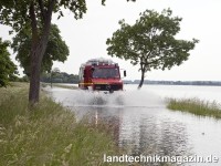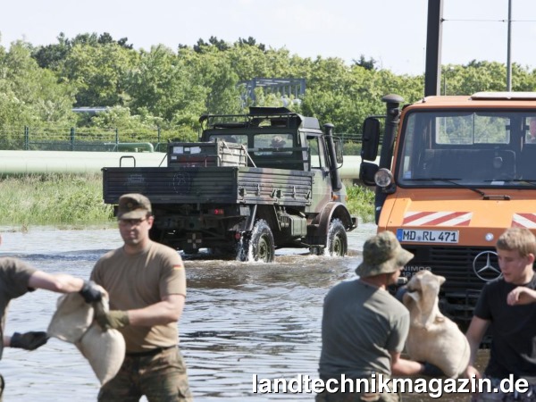 Und diese Katastrophenbewältigung geht nicht ohne Nutzfahrzeuge, das haben die abertausenden von betroffenen Menschen erlebt, die an den Brennpunkten geholfen haben, um die Folgen des Hochwassers zu mildern. Unter allen Arten von Nutzfahrzeugen ist der Unimog nach Herstellerangaben das prädestinierte und bewährte Fahrzeug für alle Hilfseinsätze. Gerade im Hochwassereinsatz zieht der Unimog seine Karten: Die Zufahrtswege zu den Deichen sind oftmals viel zu schmal für größere Lkw, besonders im Begegnungsverkehr bei überfluteten Feldwegen. Zudem verformen schwere Fahrzeuge die aufgeschwemmte Deichbasis und können diese zum Kollaps führen. Der Unimog hingegen kann mit seiner kompakten Ausführung vor den Deichen wenden und auf dem weichen Grund fahren, ohne den Bodendruck kritisch zu erhöhen.