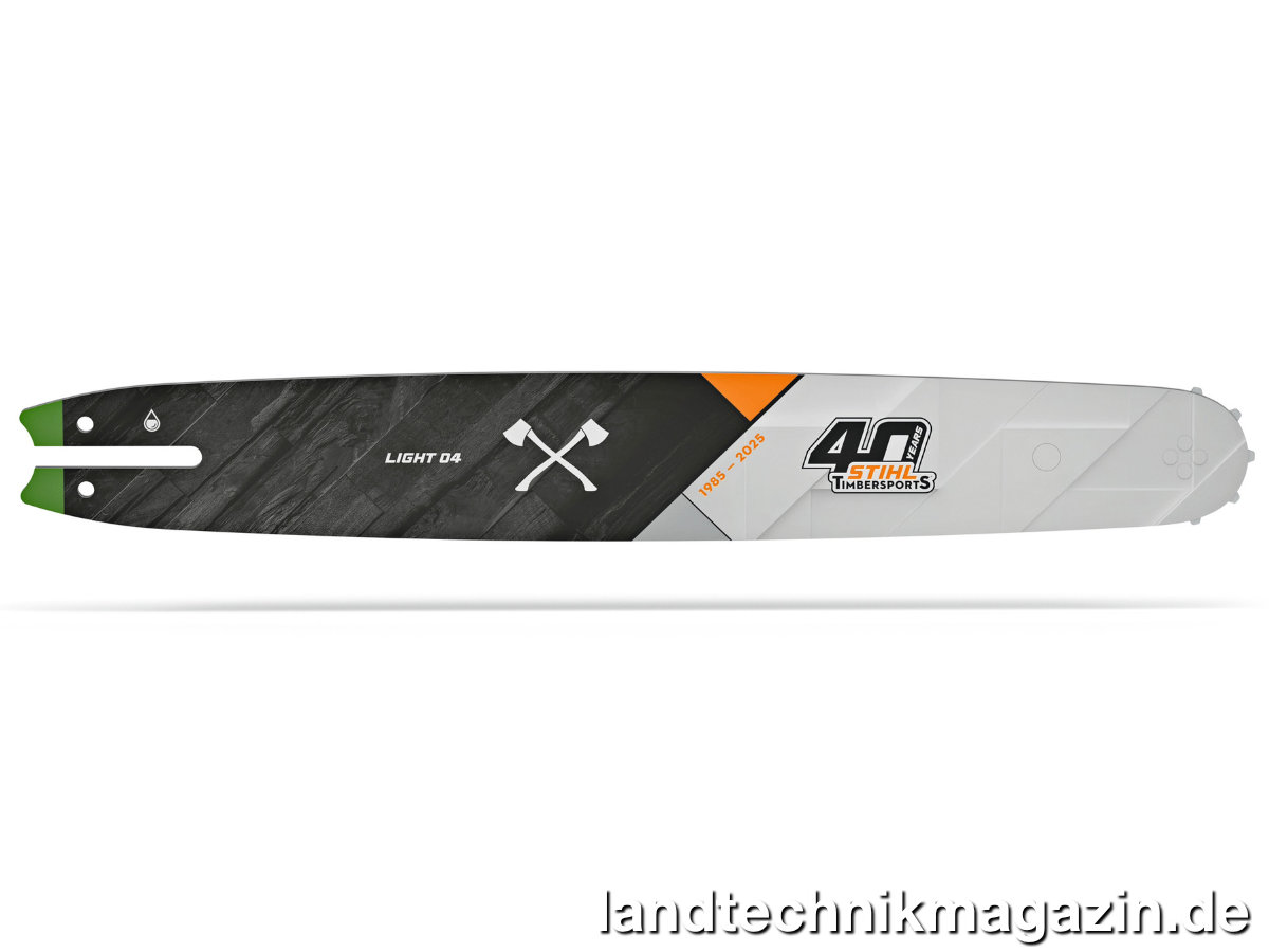 Die Sonderschienen im TIMBERSPORTS-Jubiläumsdesign sind für einen begrenzten Zeitraum in 2025 und 2026 erhältlich. Die Light 01 für private Anwendungen mit einer Schnittlängen von 35 Zentimeter und der Kettenteilung 1/4“ P, die Light 04 für Profi-Maschinen mit 40 Zentimetern Schnittlängen und der Kettenteilung 3/8“ P – beide mit 1,1 Millimetern Nutbreite. Als Preis (unverbindliche Preisempfehlung inkl. 19 % MwSt.) nennt Stihl 64,00 Euro für die Light 01 und 85,50 Euro für die Light 04.