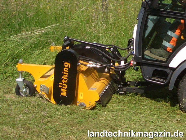 Eine völlig neue Entwicklung ist das Heck-Seitenmulchgerät MU-FM/S, welches seitlich neben und hinter dem Schlepper arbeiten kann. Es ist für Schlepper bis ca. 45 PS konstruiert und zeichnet sich durch die bewährte Müthing Anfahrsicherung mit Raumlenkerstange aus. Dadurch kann sich der Mulchkörper laut Müthing im Einsatz permanent nach oben entlasten und reduziert so die auf die Unterlenker einwirkenden Kräfte. Natürlich ist auch dieses Gerät serienmäßig mit der patentierten Kurzhäckselleiste System „Haifischflosse“ ausgerüstet.