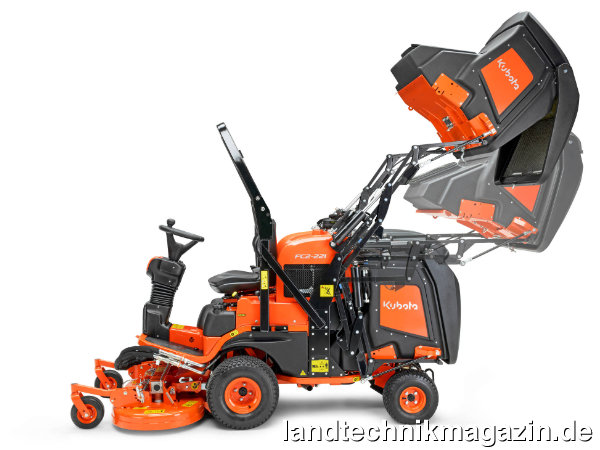 Die integrierte Grasaufnahme hat nach Herstellerangaben ein Volumen von 480 Litern. Durch die serienmäßige hydraulisch betätigte Hochentleerung kann das Schnittgut einfach auf Anhänger oder Ladeflächen entleert werden.