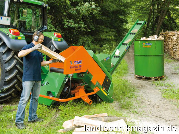 Die vollautomatische Brennholzsäge Posch SmartCut 700 schneidet nach Herstellerangaben Scheit- und Rundholz im 2,4-Sekunden-Takt und soll mit einem Bediener eine Leistung von bis zu 8 Raummeter pro Stunde (abhängig von Schnittlänge und Scheitgröße) erreichen. Die Scheite mit max. 1,2 m Länge werden nach Betätigung des EasyStop-Buügels in ergonomischer Höhe von 100 cm in die stillstehende Holzlade geschoben und rutschen durch Schwerkraft automatisch an den Holzlängenanschlag. Entsprechend der eingestellten Länge sägt die Maschine mit dem WIDIA-Blatt die Scheite ab. Der Abschnitt wird mit dem Förderband abtransportiert, das Restscheit rutscht wieder an den Anschlag und der Zyklus startet von vorne. Das Sägeblatt soll jederzeit leicht zugänglich sein – ein einfaches Öffnen der Klappe genüge.