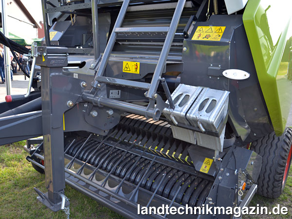 Bei der neuen Claas ROLLANT 620 ziehen Raffer das Erntegut kontinuierlich von der Pickup und fördern es aktiv in die Presskammer – es wird nicht geschnitten. Den Vorteil dieses Verfahrens sieht Claas in der verringerten Staubbildung und der höheren Futterqualität, die gerade bei der Pferdefütterung von Bedeutung ist.