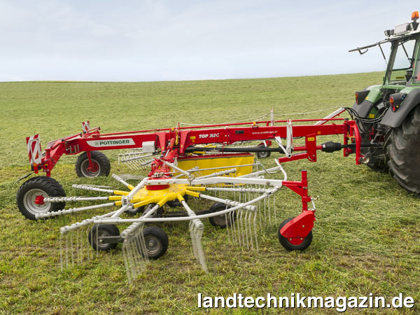 Bei den Modellen TOP 702 C und TOP 762 C kann die Arbeitsbreite auf drei verschiedene Arten eingestellt werden: mechanisch über die lange Verstellspindel, wobei Arbeitsbreiten beim TOP 762 C von 6,9 – 7,4 m und beim TOP 702 C von 6,4 - 6,8 m möglich sind oder mechanisch über die kurze Verstellspindel, hier sind Arbeitsbreiten beim TOP 762 C von 6,75 – 7,1 m und beim TOP 702 C von 6,3 - 6,5 m möglich. Durch die enge Schwadablage wird laut Pöttinger fast das gesamte Futter einmal gewendet, was vor allem beim Einsatz in Luzerne wesentlich ist – für den gleichmäßigen Trochnungsverlauf. Als dritte Variante bietet Pöttinger eine hydraulisch Einstellung an. Hier ist eine Verstellung der Arbeitsbreite beim TOP 762 C von 6,9 – 7,6 m und beim TOP 702 C von 6,45 – 7,05 m möglich.