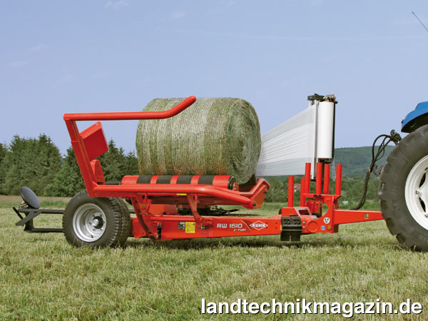 Um einen tiefliegenden Wickeltisch zu ermöglichen und so auf eine aktive Ablagedämpfung verzichten zu können, hat Kuhn bei den neuen Rundballen-Wickelgeräten RW 1410 und RW 1610 die Radachse am hinteren Ende der Maschinen angeordnet. Durch den besonders tief liegenden Wickeltisch können die Ballen laut Kuhn problemlos während der Fahrt abgelegt werden. Wegen des neuen Rahmens und des Folienschneiders sind die vier Riemen am Drehtisch des RW 1610 laut Kuhn in der Lage, schwerste Ballen bis zu einem Gewicht von 1.200 kg aufzunehmen. Dabei wird nach Herstellerangaben stets Gewicht auf den Traktor verlagert, um ein Abrutschen der Räder in hügeligem Gelände zu vermeiden.