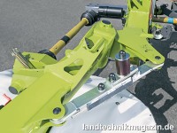 Das Flaggschiff der Claas Hecktrommelmähwerke, das CORTO 3200 CONTOUR, verfügt neuerdings serienmäßig über eine Mittenaufhängung im Schwerpunkt und die hydraupneumatische Bodenanpassung ACTIVE FLOAT, die bis dato nur optional erhältlich war. Die Anfahrsicherung mit schrägem Drehpunkt gehört ebenso zum Serienumfang wie der Riementrieb, der Lastspitzen automatisch abfedert und so den Antriebsstrang schont. Das Anhängen des neuen CORTO 3200 CONTOUR soll durch Doppelfangschalen und KENNFIXX Griffstücke an den Hydraulikleitungen deutlich einfacher sein und die neue 120°-Transportstellung sollen Gewichtsverteilung und Sicht nach hinten verbessern. Als Wunschausstattung bietet Claas eine hydraulische Transportverriegelung über einen Zylinder an, durch den das Zugseil entfällt, und eine Abstellvorrichtung, mit der das Hecktrommelmähwerk in Transportstellung gelagert werden kann. Für diese Abstellvorrichtung sind darüber hinaus auch Rollen verfügbar.