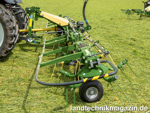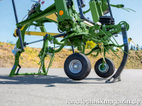Beim Hauptrahmen aus Rechteck-Profilen und dem neu gestalteten, nachlaufgelenkten Anbaubock der Highland Wender setzt Krone auf eine V-förmige Geometrie. Die soll eine optimale Aufnahme der auftretenden Kräfte und damit maximale Stabilität gewährleisten. Der Oberlenker kann in vier fixen Positionen befestigt werden, für den Einsatz des optionalen vorderen Tastrades gibt es serienmäßig zusätzlich ein Langloch. Krone betont, dass die pendelnde Aufhängung inklusive beweglicher Unterlenker-Koppelpunkte eine bestmögliche Anpassung von Rahmen und Auslegern an die Bodenkontur ermöglichen. Zudem sollen sie den passenden Ober- und Unterlenker-Anbaupunkt für optimale Transporteigenschaften, auch bei kleinen Traktoren sicherstellen. Hydraulische Dämpferstreben sorgen laut Krone dafür, dass die Vendro Highland Wender am Hang exakt, ruhig und stabil hinter dem Schlepper laufen. Darüber hinaus soll die Maschine durch die Dämpfer beim Ausheben in Transport- beziehungsweise Vorgewendestellung automatisch sanft zentriert sowie stabilisiert werden, so dass sie sich nicht hangabwärts neigt. Zusätzlich sorgen die Dämpferstreben nach Herstellerangaben dafür, dass die Zinken beim Anheben des Wenders vorne nach oben gehoben werden und so nicht in den Boden einstechen können. Als Wunschausrüstung für den Vendro 420 Highland sowie Vendro 820 Highland und serienmäßig beim Vendro 620 Highland gibt es einen Vorgewendeaushub, der die Maschine am Vorgewende in eine festgelegte Position bringt. Abgestellt werden Krones neue Wender auf breiten vorderen Abstellfüßen und einem Stützfuß hinten. Der hintere Stützfuß ist beweglich montiert, um den Einfahrweg der Dämpferstreben beim Abkuppeln auszugleichen. Da der Wender komplett auf Füßen steht, werden die Kreiseltasträder in Abstellposition nicht belastet.