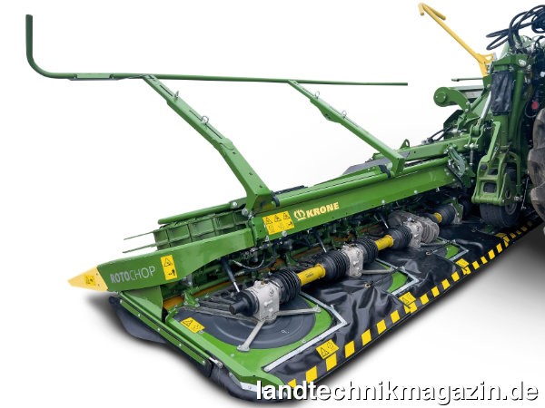 Die Mais-Erntevorsatz-Serie XCollect erweitert Krone mit dem neuen zweiteiligen Modell XCollect 750-2 mit 7,5 m Arbeitsbreite (zehn Reihen). Als Besonderheit verfügt dieser Maisvorsatz über das integrierte Mulchsystem RotoChop. Dadurch können bei der Maisernte die auf dem Feld verbleibenden Stoppeln gleichzeitig gemulcht werden, ehe sie von den Reifen des Häckslers oder der Transportgespanne an den Boden gedrückt werden. Laut Krone zerschlägt das RotoChop-Mulchsystem die Maisstoppeln bis unterhalb des ersten Halmknotens. Der Rotteprozess wird so beschleunigt und der Krankheitsdruck durch Schädlinge, wie etwa Maiszünsler, sowie Pilze, wie beispielsweise Fusarien, reduziert. Die Mulcheinheiten werden über ein eigenes Getriebe angetrieben, so dass sie bei Bedarf deaktiviert werden können. Abgesenkt und angehoben werden sie hydraulisch. Das ist aus der Kabine per Tastendruck möglich, so dass auch kurzzeitig auf wechselnde Bedingungen reagiert werden kann. Zudem werden die Mulcheinheiten auch bei Überlast kurz angehoben und wieder abgesenkt. Die beiden Seitenrahmen des Maisvorsatzes lassen für den Straßentransport vertikal einklappen, so dass die Transportbreite inklusive Mulcher laut Krone nur 3 m beträgt. Dabei sorgt laut Hersteller ein intelligenter Klappmechanismus für die Mulcher für ein stets ein ausreichend großes Sichtfeld für die Bedienperson. Eine vollintegriertes hydraulisches Transportfahrwerk zur Entlastung der Vorderachse und Erleichterung der Zulassung für den Straßenverkehr bietet Krone für das XCollect 750-2 ebenso an, wie einen vollintegrierten Komfort-Frontschutz mit Beleuchtung.