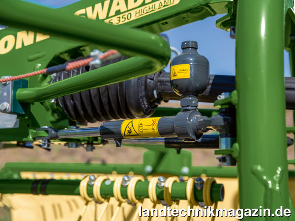 Hauptrahmen und Anbaubock hat Krone beim Swadro S 350 Highland und Swadro S 380 Highland aus abgerundeten (Hauptrahmen) respektive Rund-Profilen (Anbaubock) konstruiert. Das soll maximale Stabilität ermöglichen und die Selbstreinigung verbessern. Dem Einsatz mit eher kleinen Traktoren und Hangschleppern trägt Krone mit einem verkürzten Anbaubock mit zwei Anbaupositionen Rechnung. In diesem Zusammenhang sei erwähnt, dass der Hersteller das Gewicht mit 465 kg für den Swadro S 350 Highland beziehungsweise 490 kg für den Swadro S 380 Highland und den Leistungsbedarf für beide Modelle mit 22/31 kW/PS beziffert. Serienmäßig gibt es bei den neuen Krone Alpin-Schwadern Dämpferstreben mit integrierter Ausgleichsschwinge, die das Nachlaufverhalten der Maschine am Hang nachhaltig verbessern sollen. Darüber hinaus wird der Schwader durch die Dämpfer laut Krone beim Ausheben sanft zentriert und stabilisiert und neigt sich nicht hangabwärts zur Seite. Um die Hangabdrift des Schwaders zu reduzieren setzt Krone auf ein starres 2-Rad-Fahrwerk mit Reifen der Größe 16x6.50-8. Auf Wunsch gibt es ein, mit Reifen der selben Dimension ausgerüstetes, 4-Rad-Fahrwerk. Für eine optimale Bodenanpassung sowohl in Fahrtrichtung als auch quer zur Fahrtrichtung zeichnet bei den neuen Schwadern laut Krone die Kombination aus pendelnder Unterlenkeranhängung und spezieller Aufhängung zwischen Hauptrahmen und Anbaubock verantwortlich. Als Wahlausrüstung ist ein vorderes Tastrad für extrem buckelige Bodenverhältnisse verfügbar. Zur Serienausstattung gehört beim Swadro S 350 Highland und Swadro S 380 Highland eine Verstellmöglichkeiten der Kreisel-Querneigung, um Schwadform und Rechqualität beeinflussen zu können.