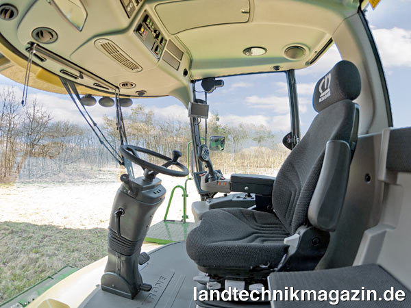 Neben der neuen Motorenausstattung bietet der Big M 420 auch die neu gestaltete und noch geräumigere SilentSpace Kabine. Mehr Glasfläche und schlankere Holme sorgen, so Krone, für bisher ungekannte Übersicht im Fahrerhaus. Hochwertige Verarbeitung und eine verbesserte Dämmung sollen geringste Geräuschpegel ermöglichen. Die Klimaautomatik und eine mobile Kühlbox sorgen darüber hinaus für Komfort; beide Features sind beim neuen Big M serienmäßig. Der von Krone neu entwickelte Joystick wurde nach Herstellerangaben speziell für die Anforderungen von selbstfahrenden Mähaufbereitern konzipiert und vereint die neuesten Erkenntnisse ergonomischer Wissenschaft mit umfassender Multifunktionalität. Mit einem Kreuztaster können zum Beispiel alle Mähwerke zeitgleich am Vorgewende angehoben und abgesenkt werden. Zusätzlich kann über den Kreuztaster auch der optionale Hangausgleich angesteuert werden. Für jedes Mähwerk ist jeweils eine Taste auf dem Joystick hinterlegt; so kann der Fahrer den Einsatz der einzelnen Mähwerke an die jeweilige Arbeitsfläche bestmöglich anpassen, wie beispielsweise in keilförmigen Beständen. Über zwei weitere Tasten wird die optionale hydraulische Schnitthöhenverstellung gesteuert. Es können zwei Schnitthöhen gespeichert und abgerufen werden. Eine, so Krone, echte Entlastung für den Fahrer, da er die Maschine schnell und einfach an unterschiedliche Erntebedingungen anpassen kann.