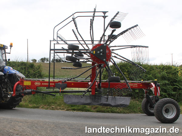 Das eingangs erwähnte neue Rahmendesign des Vicon Andex 804 umfasst einen um 20 % dickeren Hauptrahmen, durch den das Gewicht nun 2.065 kg beträgt. Eine neue gestaltete Radachse ermöglicht größere Reifen (380/55), ist aber unter 2,75 m breit. Dadurch kann der Mittelschwader für den Transport auf 2,95 m Breite geklappt werden, ohne eine Transporthöhe von 4 m (3,90 m) zu überschreiten. Die Klappung erfolgt übrigens ebenfalls hydraulisch. Um Wendigkeit und Manövrierbarkeit des Schwaders auf kleinen Flächen zu optimieren, ist ein möglicher Einschlagwinkel von 80° vorgesehen.